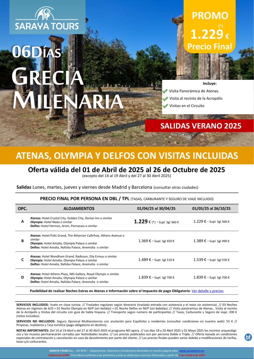 Promo! Grecia Milenaria 6 días: Circuito Atenas, Olympia y Delfos con Visitas Incluidas hasta Oct 26